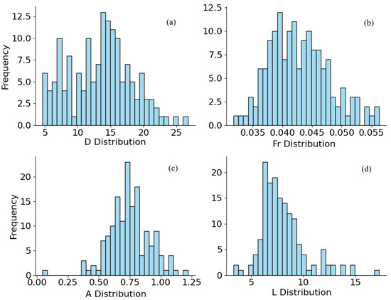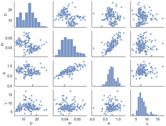 As displayed in Figure 8, a correlation analysis was performed to validate the selection of the explanatory variables, Fr, D, A, and L. In general, the selected variables demonstrate appropriate levels of intercorrelation, ensuring that each contributes uniquely to the predictive power and interpretability of the analysis.