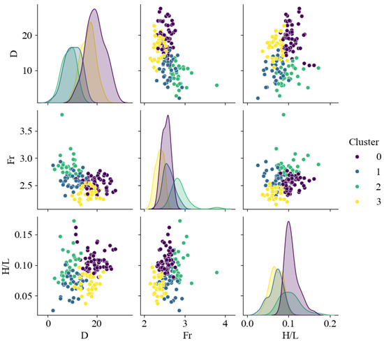 Figure 10 shows the parallel coordinate plot, where each data point is represented by a line connecting values on the axes for D, Fr, and . The diagonal plots display the kernel density estimates for each variable, showing the univariate distributions of D, , and for each cluster. The clusters are color-coded: clusters 0, 1, 2, and 3. This figure offers a multivariate perspective on the data, enabling a clear visualization of the patterns in each cluster across the three variables. The differences in the parallel lines indicate the variations in the variables between clusters, further confirming the effectiveness of the K-means clustering algorithm in separating the data into meaningful groups.