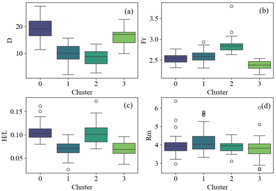 Figure 11 presents the distributions of variables D, Fr, , and the objective variable for each cluster using box plots, enabling a better understanding of the variation and central tendency within each cluster. The distribution of D across the four clusters shows that Cluster 0 has a higher median value compared to the other clusters, with Cluster 1 and Cluster 2 exhibiting similar distributions. For the distribution of Fr, Cluster 3 has a noticeably higher median value than the other clusters. The box plot in for Cluster 3 displays a lower median and narrower interquartile range compared to the other clusters. Finally, regarding the objective variable , Cluster 3 shows a significantly higher median than the other clusters, particularly compared to Cluster 0 and Cluster 1, which exhibit overlapping distributions.