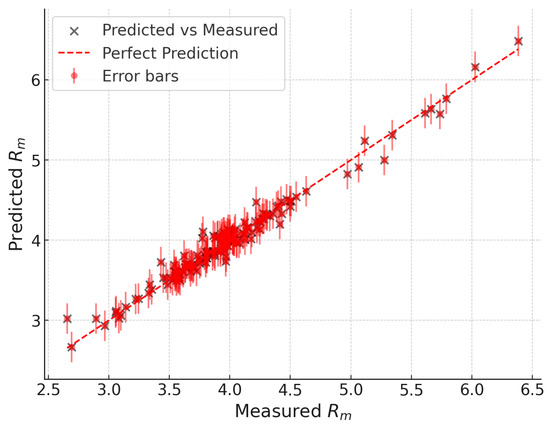 Figure 12 compares the predicted with the measured values. Each point represents a pair of measured and predicted values, and the red crosses indicate the error bars, which represent the uncertainty in the predictions. The dashed red line represents the 1:1 scenario where the predicted perfectly matches the measured . The plot visually shows how closely the predictions align with the actual values, with points closer to the dashed line indicating better model performance. Deviations from the red dashed line suggest prediction errors.