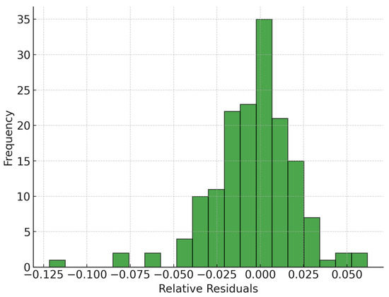 with the relative residual. We can see from the figure that the values of are mainly concentrated around 0, mainly between −0.05 and 0.05, indicating that the majority of the predicted values are close to the actual values, with only a few significant deviations. The distribution appears to be roughly symmetric, with a peak around zero and relatively small deviations on either side, suggesting that the model is performing well overall. However, the presence of with larger magnitudes suggests there are still occasional prediction errors, especially for specific instances within the dataset.