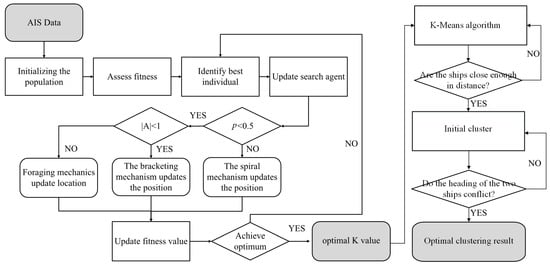 The traditional K-means algorithm has the advantages of simplicity and fast processing of large amounts of data, but it has the disadvantages of being sensitive to the selected K-value. Furthermore, the initial K-value needs to be determined manually, and the K-means algorithm easily falls into a local optimum, and is sensitive to outliers [17]. To address these issues, K-means can be optimized using the whale optimization algorithm (WOA). The WOA simulates the behavior of whale groups, combining the advantages of global and local search, adaptive adjustment, high efficiency and robustness, and fast data processing, which can find the optimal K-value and the initial clustering center [18]. In the WOA–K-means algorithm, the whale represents the potential locations of the clustering centers, while the ship data points represent the actual data to be clustered. The whale optimizes the clustering results by continuously adjusting its own position, aiming to partition the ship data points into different clusters. In this manner, the whale optimization algorithm and the ship data points are interconnected to achieve the optimization task of the clustering algorithm. The specific process is shown in Figure 2.