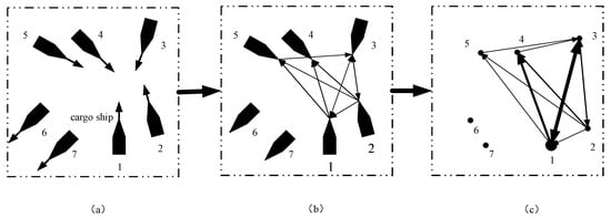 (a) Ship position and heading; (b) directed composite network considering ship collision risk; (c) multi-weighted directed network, where node sizes represent type weights, and the thickness of connected edges represent speed weights.