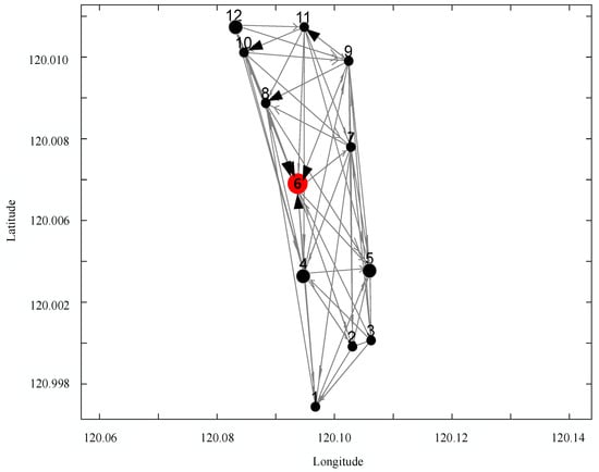 This multi-weighted directed complex network considers ship type, speed, and collision risk. The collision risk between two ships is determined according to Section 2.2. If two ships are at risk of collision, they will be connected by a line with an arrow, where the arrow points from the stand-on ship to the give-way ship. The width of the line with an arrow is proportional to relative speed. This enables this complex network to better describe the dynamic relationships between ship nodes [27].