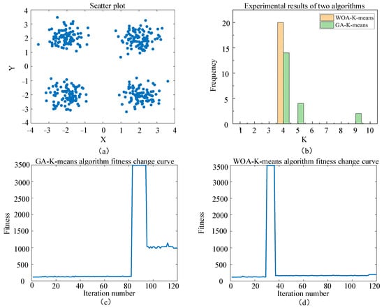Comparison results between GA-K-means algorithm and WOA-K-means algorithm. (a) is the simulated experimental scene, (b) is the comparison graph of the two types of algorithms to find the best K value, (c) is the GA-K-means optimization search iteration graph, and (d) is the WOA-K-means optimization search iteration graph.