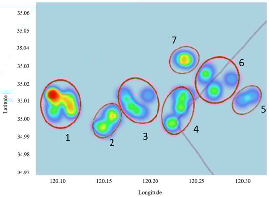 In transportation planning, researchers often prioritize analyzing traffic conditions using heat maps, with a particular emphasis on regions displaying elevated heat values. These values often indicate the presence of complex water areas, akin to traffic congestion or substantial traffic volumes [39]. To assess the accuracy of the WOA–K-means optimization algorithm in identifying complex water regions, ship AIS data (same as the data shown in Figure 6) was used to generate a heat map depicting ship distribution (see Figure 8). The heat map indicates that the ship distribution aligns closely with the divisions made by the WOA–K-means algorithm, revealing seven water area with a notable concentration of ship clusters. Of particular significance is the observation that the heat value of ships in the first water area is the highest, aligning with the complexity assessment conducted in Section 3.3. These findings underscore the high accuracy of the optimization algorithm and risk degree calculation model introduced in this paper, as demonstrated in practice.