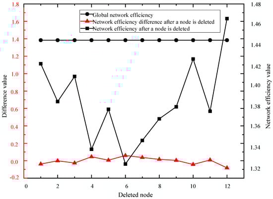 To verify the accuracy of complex networks for the identification of high risk ships [40], this study employs a targeted deletion to further validate the efficacy and precision of identifying key nodes based on a multi-weighted directed complex network. It examines the alterations in the global network efficiency of this complex network before and after deleting the high risk ship nodes [41]. The specific experimental outcomes are depicted in Figure 9.