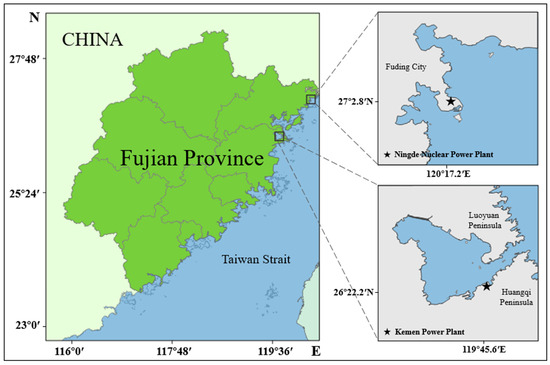 The Ningde Nuclear Power Plant is located in Beiwan village, Taimushan town, Fuding city, Ningde, Fujian Province, and is positioned on the west coast of Qingchuan Bay, approximately 32 km southeast of Fuding urban area (Figure 1). The planned capacity of the plant is 6-million-kilowatt units. The project was constructed in two phases, with 4 units in the first phase and 2 units in the second phase. The circulating cooling scheme of the units adopts a seawater once-through cooling scheme. The water intake and displacement of the first phase units are 130 m3/s, and the design temperature rise of the thermal discharge is 8.35 °C. The first phase of the project utilized the open channel drainage type, with the drainage outlet located on the northeast side of the plant area directly facing the open sea.