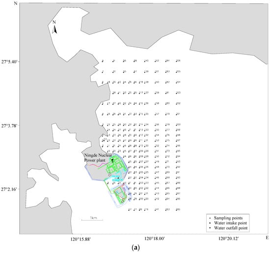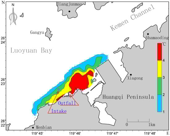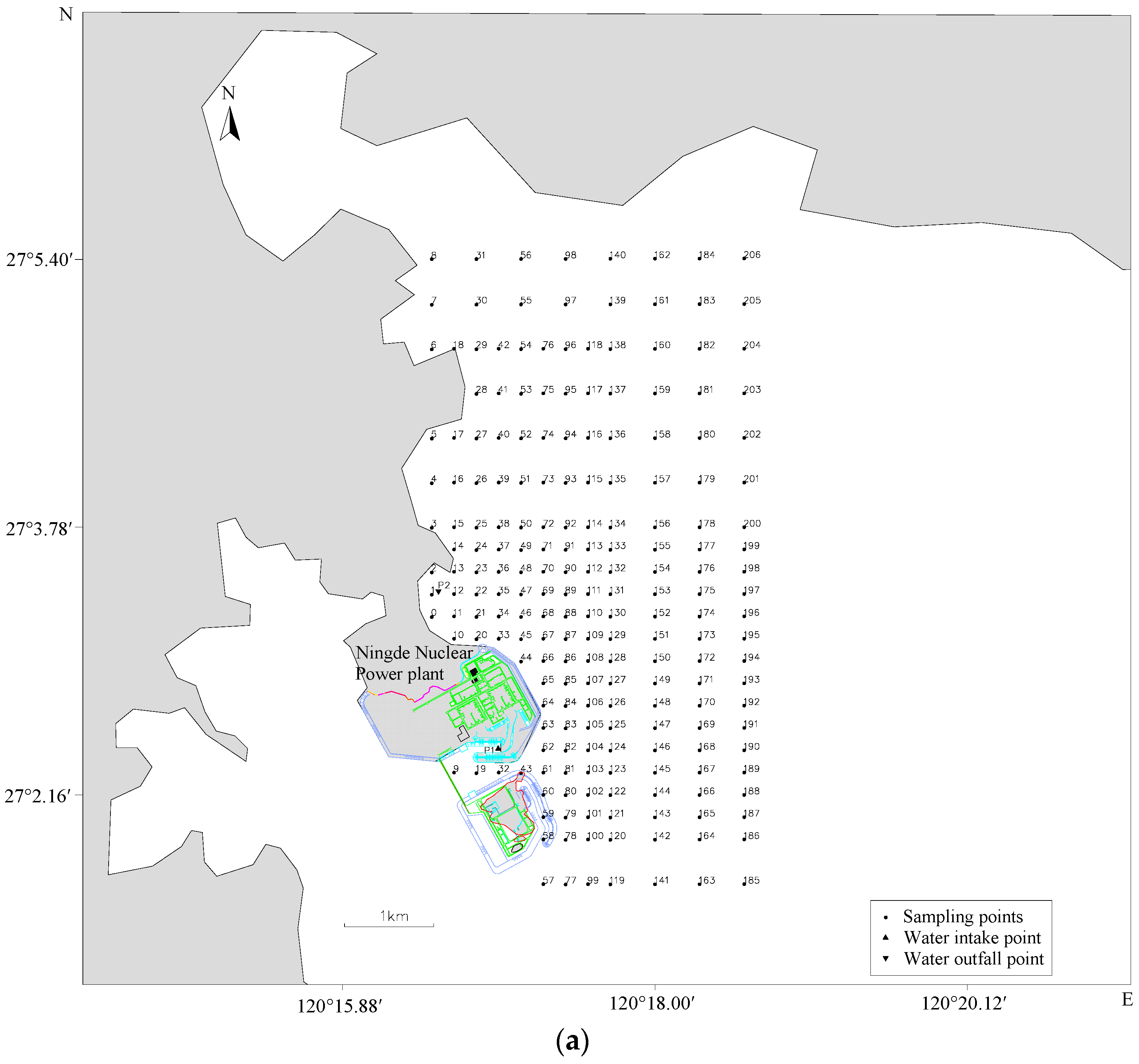 With the rapid development of the marine economy and the increasing demand for electricity, the number of power plants being planned and constructed in coastal areas is constantly growing. The operation of power plants requires a large amount of continuous supply of cooling water to solve the cold source of heat engines and other cooling problems, and the waste heat carried by circulating cooling water is carried directly into the sea, resulting in thermal discharge. Compared with other pollution sources, thermal discharge is characterized by high temperature and large volume, so it has a very obvious impact on marine ecology [1]. Thermal discharge disseminates a significant amount of heat into the surrounding environment, not only causing abnormal temperature rises in local sea areas and thereby disrupting the original temperature distribution of the water body but also impacting the water quality and the ecological environment [2,3]. Thermal discharge may modify the physical and chemical characteristics of the water body and may also directly pollute and influence the marine ecosystem, encompassing the growth and reproduction of marine organisms, as well as the material cycles and energy flows within the ecosystem. At present, the marine ecological problems caused by thermal discharge from coastal power plants have attracted increasing attention.