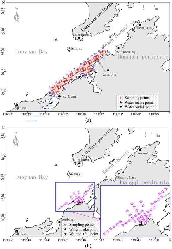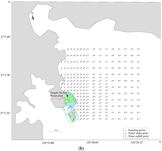Water temperature observation stations during flood tide (a) and ebb tide (b) at the site of the Ningde Nuclear Power Plant.