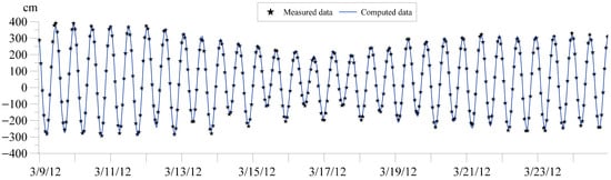 To assess the reliability of the tidal current field model, validations of tidal levels and tidal currents were first conducted via observational data of tidal levels and currents collected in the Luoyuan Bay area in March 2012. Figure 4 presents the verification station map for tidal levels and tidal currents. Figure 5 shows a comparison curve between the measured and calculated tidal levels at station T1, indicating that the computed data coincided with the measured data. Figure 6 shows the verification curves of the current velocity and direction at the tidal current stations, which demonstrate that the calculated values at each station are essentially consistent with the measured values.
