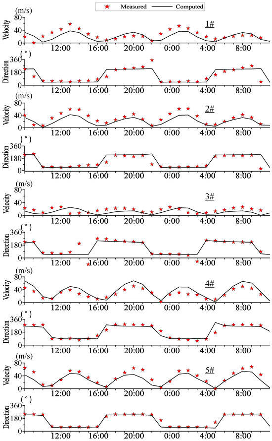 Comparison of measured and calculated current velocity and direction at stations 1#–5#.