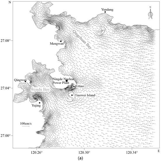 The current field diagrams for both flood and ebb tides in Luoyuan Bay and its adjacent waters during spring tides are presented in Figure 9. As depicted, the oceanic inflow divides into two branches just outside the entrance of Luoyuan Bay during flood tide. One branch flows northward toward Dongchong Pass, whereas the other branch enters the bay through the entrance and subsequently fans out, flowing toward the westernmost waters of the bay along the northwestern channel, the central shallow waters, and the southwestern channel (Figure 9a). During ebb tide, the direction of the currents is basically opposite to that of the flood currents. The water flows in the northern, central, and southern parts of Luoyuan Bay converge toward the Kemen Waterway in the southeast, east, and northeast directions, respectively, and then flows out to the open sea through the entrance of Luoyuan Bay (Figure 9b).