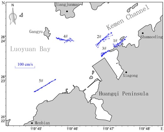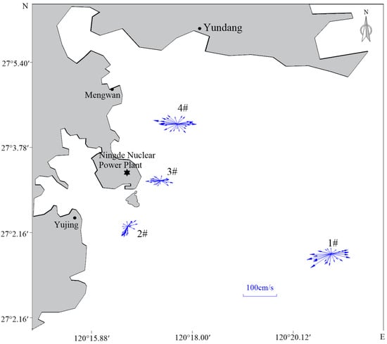 The vertically averaged flow vector diagram for various stations in the vicinity of the Ningde Nuclear Power Plant site during the spring tides in June 2016 is presented in Figure 8, which was plotted via tidal current data collected from hourly observations spanning 27 h at each station. As shown in the diagram, the tidal currents at Stations #2, #3, and #4 in the front sea area of the nuclear power plant site exhibit rotational flow characteristics. For the tidal currents at station #1, which are located slightly offshore, although they display rectilinear flow properties, the flow direction has a certain degree of rotation.
