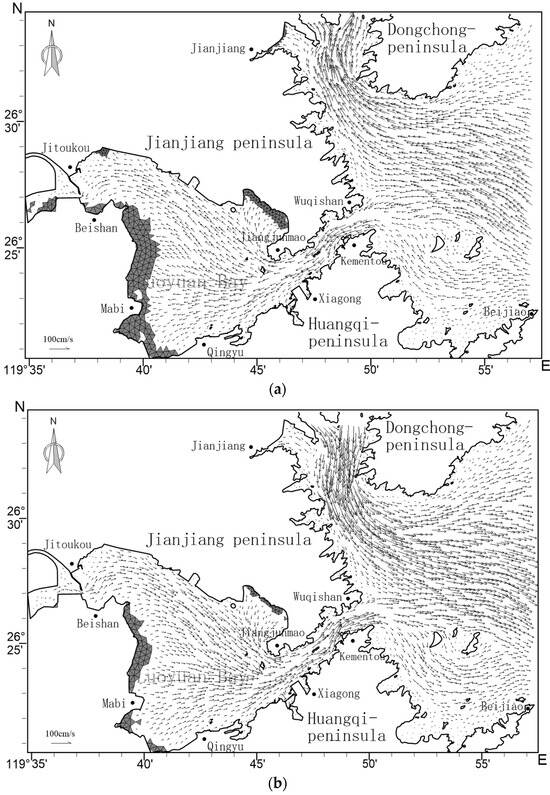 Flood tide (a) and ebb tide (b) in Luoyuan Bay and its vicinity waters.