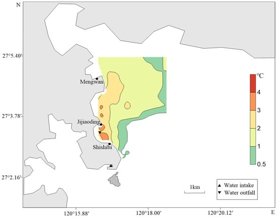 On the basis of the analysis results of the water temperature rise near the outfalls of the two power plants, the thermal discharge from the coastal power plant spreads outward from the outfall, with the temperature rise decreasing as the distance from the outfall increases. Mei et al. [26] pointed out that after the thermal discharge enters the sea area, a temperature rise zone forms near the outfall, with the scope of nearshore sea water temperature rise exceeding 3 °C primarily confined within a 300–500 m radius from the outfall, and the temperature rise diminishes as the distance from the outfall increases. Jia et al. [29] also mentioned that the thermal discharge from coastal power plants basically spreads towards the open sea from the discharge center, and the temperature rise becomes smaller as the distance from the outfall increases. Therefore, the result of this study is consistent with their findings on this point.