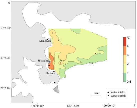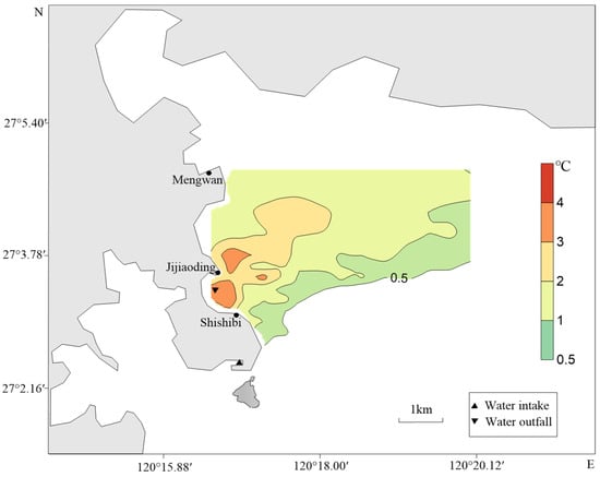 As shown in Figure 11, within the observation range during the flood tide period, the envelope of temperature rise exceeding 3 °C is concentrated mainly in localized areas east and north of the outfall, with the maximum temperature rise not exceeding 4 °C; the envelope of temperature rise exceeding 2 °C spreads south toward the Shishibi sea area and north toward the more distant Mengwan sea area; the range of temperature rise exceeding 1 °C extends north beyond most of the survey area’s boundaries, reaching a maximum distance of approximately 3.2 km offshore from the outfall; and the temperature rise in other areas is less than 1 °C. According to Figure 12, within the observation range during the ebb tide period, the envelope of the temperature rise exceeding 3 °C is mainly concentrated in localized areas to the east and northeast of the outfall, with the maximum temperature rise not exceeding 4 °C; the envelope of the temperature rise exceeding 2 °C mainly spreads northeast to approximately 3.3 km away from the outfall; the range of the temperature rise exceeding 1 °C extends northward beyond the boundary of the surveyed area and southward from the Shishibi sea area toward the east-northeast, reaching the eastern boundary of the surveyed area; and the temperature rise in the southern part of this range is less than 1 °C.