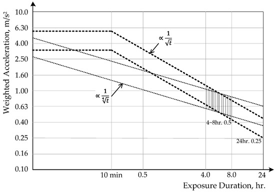 ISO 2631-1:1997 [20] provides guidelines on the impact of all forms of vibration (motion) on the human body in the form of frequency-weighted RMS (Root Mean Square) acceleration. The frequency range for human health or comfort is specified as 0.5 to 80 Hz, and the frequency range for seasickness is specified as 0.1 to 0.5 Hz [20,24]. In general, vibrations (motions) that begin to make humans feel uncomfortable have an acceleration of approximately 0.315 to 0.63 m/s2 (see Table 1). The impact of vibrations on human health and comfort, depending on exposure time, is depicted and presented as the “health guidance caution zone” in Figure 1. According to this, at a vibration exposure time of 24 h, caution is required at an acceleration of 0.25 m/s2, and at an exposure time of 4 to 8 h, caution is required at an acceleration of approximately 0.5 m/s2 [25].