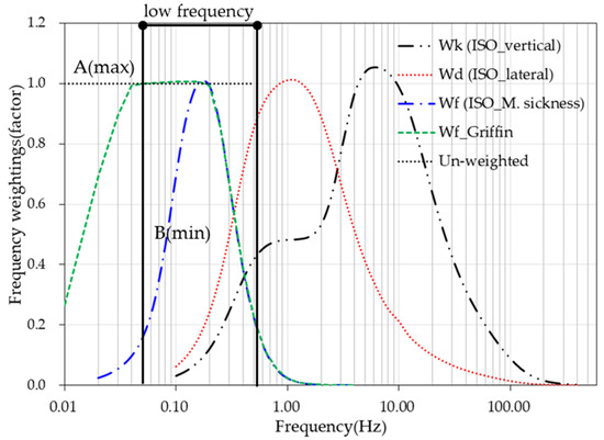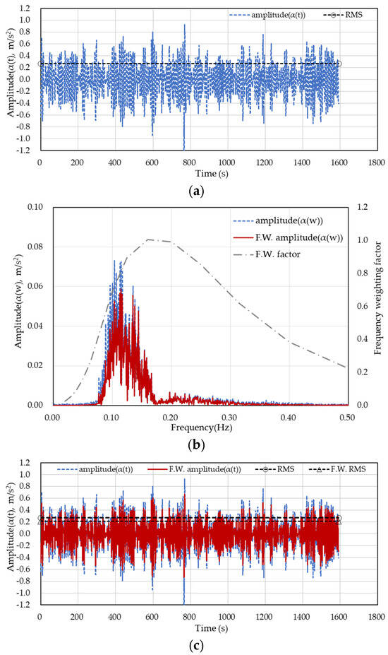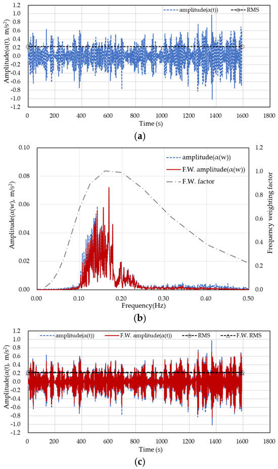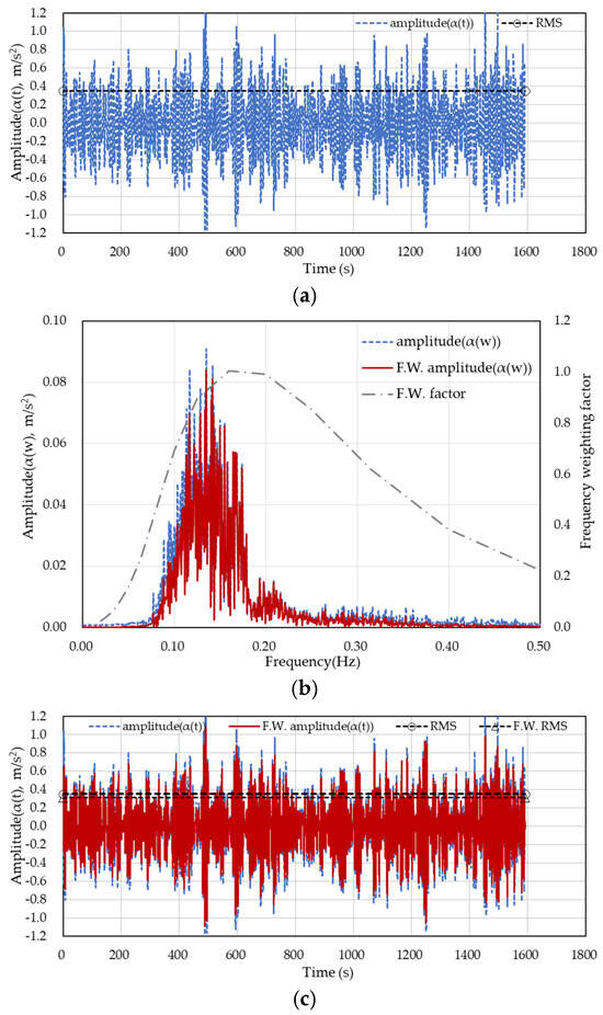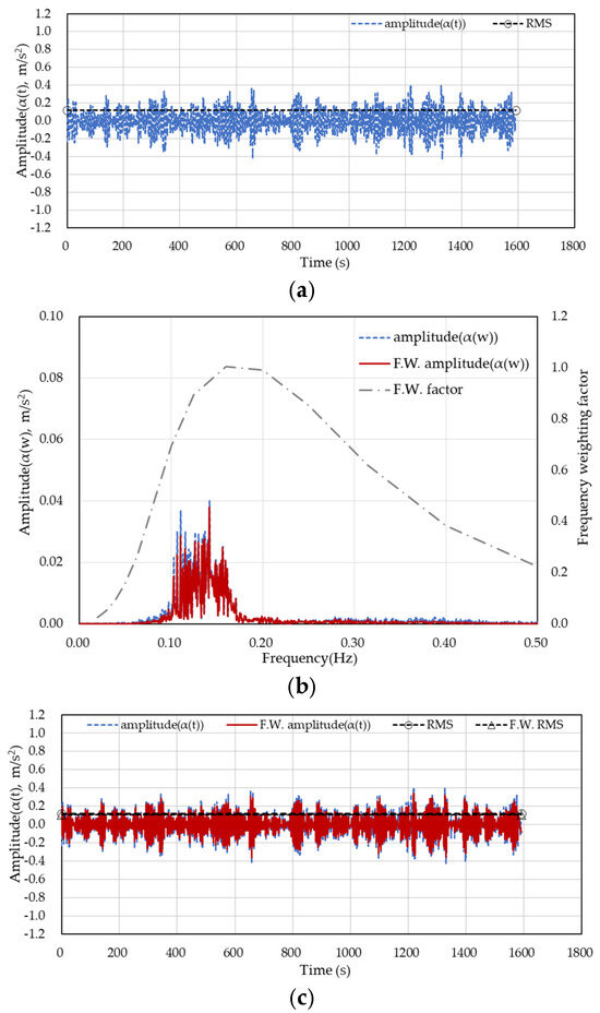 where, αw represents the frequency-weighted RMS acceleration, αw(t) represents the time-domain signal of frequency-weighted acceleration, which is the measured acceleration signal multiplied by the frequency-weighting function as presented in Figure 3 [20,26], and T represents the acceleration measurement time. Additionally, some guidelines, such as Nordforsk [21], use un-weighted RMS acceleration as an evaluation indicator.