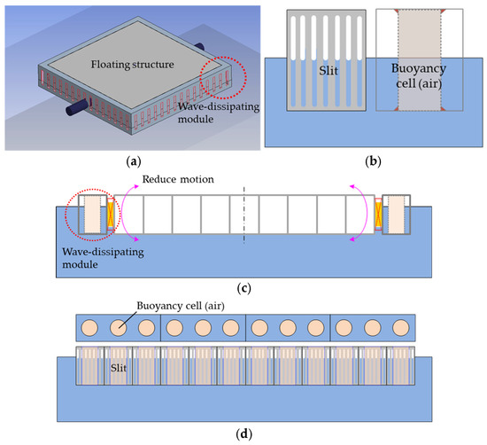 This paper proposes a method to improve serviceability by reducing the wave motion of the main floating structure by placing wave-dissipating modules on the outer edges of the main floating structure, as presented in Figure 4. The wave-dissipating module consists of external slits and internal buoyancy cells in Figure 4b; the slits are designed to dissipate wave energy, and the buoyancy cells are intended to ensure their self-buoyancy.
