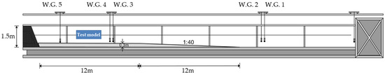 The free water surface was measured with the capacity type wave gauges. The separation of incident and reflected waves were performed at two locations (W.G. 1 and 2 and W.G. 3 and 4 in Figure 5) by Goda and Suzuki [33]. The transmitted wave was measured with the wave gauge 5 (W.G. 5). The irregular waves were generated with JONSWAP wave function.