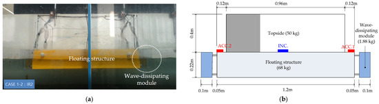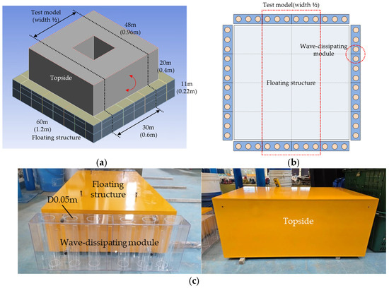 The test model was designed based on the floating marine city design shown in Figure 6, applying a Froude similarity ratio of 1/50. To investigate only the unidirectional motions of heave and pitch in the 2D wave flume test, only half the width of 1 unit was manufactured. The detailed specifications of the test model are shown in Table 2. The test model was categorized into four cases according to the combination of floating structure, topside, and wave-dissipating module, as shown in Table 3. The floating structure and wave-dissipating module were connected by steel rods.