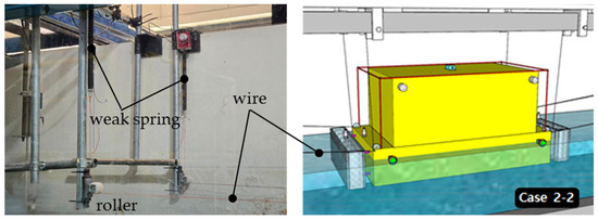 The installation of the test model in the 2D wave flume is shown in Figure 5 and Figure 7. The main objective of this experiment is to measure the free-body motion of the floating structure. However, to minimize the surge motion of the floating structure due to wave loads, a mooring system using a wire rope connected to a weak spring was applied to allow semi-free body motion. The weak spring-wire mooring was connected to the four corners of the floating body, as shown in Figure 8. Consequently, the surge motion of the floating body was minimally restricted, while the heave and pitch motions, which are the main measurement items of this study, were allowed. This represents semi-free body motion. The influence of the weak spring-wire mooring used in this study on the heave and pitch motions of the floating body is considered to be minimal, and it is deemed an appropriate method to identify the influence of the wave-dissipation modules on the free body motion of the floating body. The floating structure’s motion was measured accurately using a motion capture system with ultraviolet cameras. Additionally, inclinometers were installed at the center and four accelerometers at the corners of the floating structure for further measurements.