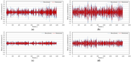 To assess the serviceability regarding human comfort, it is recommended to use the acceleration values measured at the corners of the floating structure, where the most unfavorable acceleration values are typically observed, with a measurement duration of at least 2 min for low-frequency areas below 2 Hz [34]. Consequently, the maximum acceleration location was determined to evaluate the serviceability of the floating structure using the experimental results. The acceleration time history data for the bow and stern are shown in Figure 9.