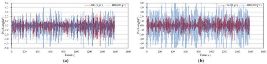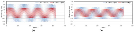 Response time history due to wave-dissipating module under regular wave: (a) CASE 1 series (100 yr.); (b) CASE 2 series (100 yr.).