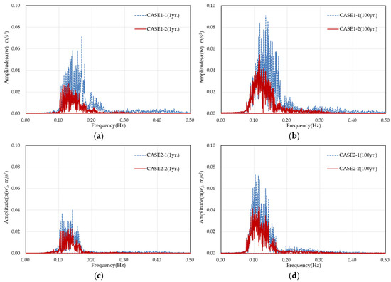 Response spectrums due to wave-dissipating module under irregular wave: (a) CASE 1 series (1 yr.); (b) CASE 1 series (100 yr.); (c) CASE 2 series (1 yr.); (d) CASE 2 series (100 yr.).