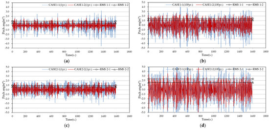 The RMS inclinations of the floating structure with the wave-dissipating module were calculated in the same method as the prototype. The influence of the wave-dissipating module on the RMS inclination of the floating structure was analyzed for wave loads with 1-year and 100-year return periods, and the results are presented in Figure 17 and Table 9. The analysis results for the RMS inclinations for the 1-year return period wave load indicated that, with the wave-dissipating module, CASE 1 series showed approximately 55% level of the prototype’s RMS inclination, and CASE 2 series showed approximately 66% level. For the 100-year return period wave load, the RMS inclination with the wave-dissipating module for CASE 1 series was approximately 77% level of the prototype, and for CASE 2 series, it was approximately 67% level.