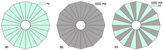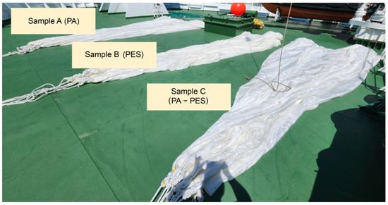 Three sea anchor canopies of varied materials were manufactured to evaluate the potential to enhance or replace PA material (Figure 2 and Figure 3). Sample A was designed to reflect commercial products using PA fabric. In contrast, Samples B and C were experimental models constructed to be the same size as real sea anchor canopies. Sample B was made of PES fabric, and Sample C had an alternating combination of PA and PES fabric in each strip.