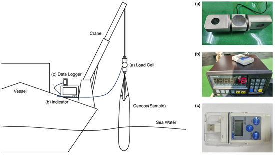 To evaluate the seawater drainage and drying efficiency of different sea anchor canopy samples after seawater submersion, we measured changes in their weight at 1 min intervals using a data logger connected to a load cell, which recorded the changes in weight of the sea anchor canopies as they dried over time, and a digital weighing indicator (Figure 4; Table 3). This process was repeated twice on different dates, and the resulting data were compiled for analysis.