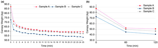 Canopy weight variation over time for each sample: (a) weight change of each sample up to 25 min and (b) initial seawater included weight and change after 60 and 120 min.