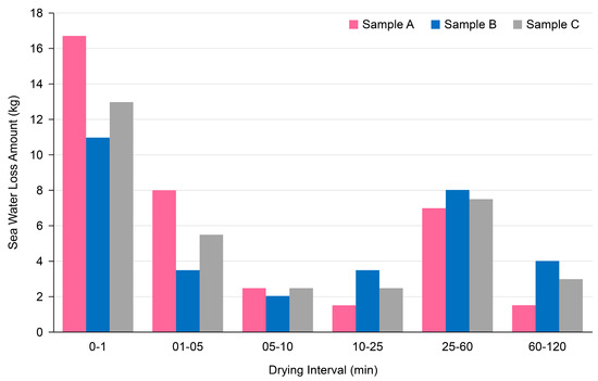 During the first minute, the water content of Sample A decreased by 16.7 kg, followed by reductions of 8.0 kg up to 5 min, 2.5 kg up to 10 min, 1.5 kg up to 25 min, 7.0 kg up to 60 min, and 1.5 kg up to 120 min (Figure 7). Sample B lost 11.0 kg of weight in the first minute, followed by further losses of 3.5 kg up to 5 min, 2.0 kg up to 10 min, 3.5 kg up to 25 min, 8.0 kg up to 60 min, and 4.0 kg up to 120 min. Sample C lost 13.0 kg of seawater in the first minute, followed by further losses of 5.5 kg up to 5 min, 2.5 kg up to 10 min, 2.5 kg up to 25 min, 7.5 kg up to 60 min, and 3.0 kg up to 120 min (Figure 7). Overall, these results demonstrate that Sample A showed the fastest initial drainage properties. However, Sample B showed the fastest drying performance over time, particularly at 60 min, suggesting its potential utility for drainage and drying when the sea anchor is wound around a winch drum or stored on the deck, and Sample C showed intermediate performance, combining the properties of the two materials.