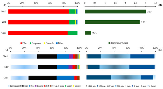 - Collard, F.; Gilbert, B.; Eppe, G.; Roos, L.; Compère, P.; Das, K.; Parmentier, E. Morphology of the Filtration Apparatus of Three Planktivorous Fishes and Relation with Ingested Anthropogenic Particles. Mar. Pollut. Bull. 2017, 116, 182–191. [Google Scholar] [CrossRef]