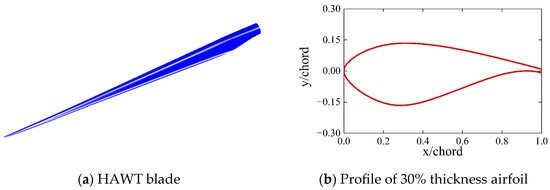 Through preliminary access, the phenomenon of flow separation is easy to occur from the middle to the root position of the HAWT blade, and the middle position has a great impact on the aerodynamic performance of the blade. Therefore, the airfoil located in the middle of the blade was selected for the aerodynamic performance study. Its profile is shown in Figure 1b. The airfoil has a maximum relative thickness of 30% and ensures that the blade has a high structural strength. According to the experimental conditions, a model of equal chord length was designed, with a chord length of 0.6 m and a spanwise length of 1.5 m.