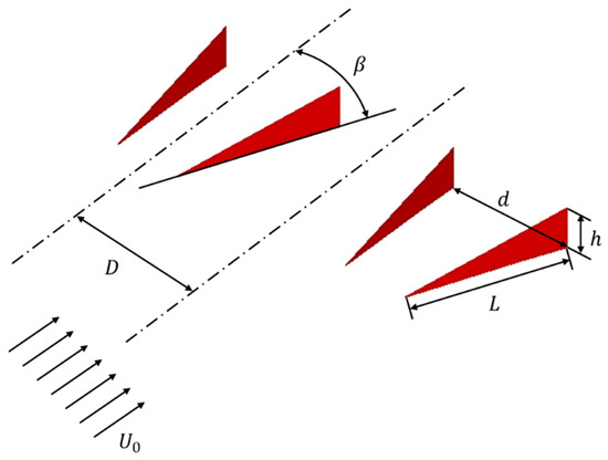 The size ratio of the VG was chosen in a scheme that significantly improved the airfoil lift-to-drag ratio in smooth wall conditions from Ref. [11]. It is a clear demonstration of the VG’s improved aerodynamic performance. And it prevents blurry results due to unreasonable VG size. Based on this, the actual dimensions of VG was determined proportionally by the experimental model of this study. The relevant geometric parameters of the vortex generators are tabulated in Table 2. And the schematic diagram of VG geometric parameters is shown in Figure 2. is the geometric vane inflow angle, d is intravane spacing, is the intervane spacing, L is the length, and h is the vane height.