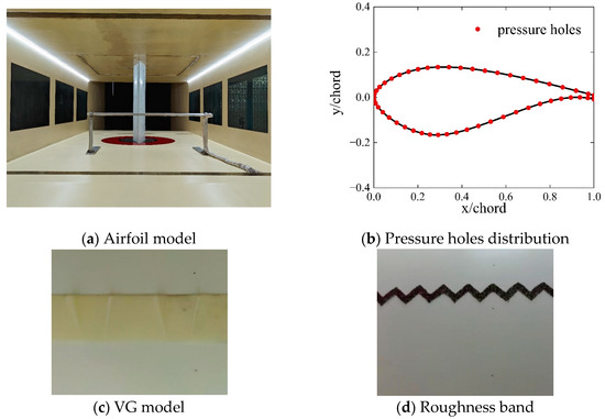 The experiment was completed in the wind tunnel of North China Electric Power University. Its equipment structure is a closed-mouth reflow all-steel structure, and the airflow can be balanced by means of the relevant pressure regulating device. The turbulence intensity of the inflow in the test section is 0.3%. The experimental model of the wind tunnel is shown in Figure 3. The number of 52 surface pressure holes with a diameter of 0.8 mm are arranged in the middle of the model and appropriately encrypted at the leading edge. ESP-64 highly integrated pressure scanning valve was used in the experiment. The number of sampling points for each pressure measurement point is 1000, the sampling time is 10 s, and the frequency is 0.01 HZ. The measurement results are generally reliable. The VG model is 3D printed using resin material, as shown in Figure 3c. The roughness band is pasted on the surface of the airfoil to simulate the surface roughness, as shown in Figure 3d. At the same time, it is installed at 5% of the chord length from the leading edge.