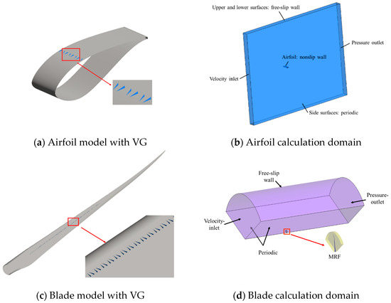 As shown in Figure 4c, the calculation model was established from the actual size of the HAWT blade, including 108 pairs of vortex generators. For the blade calculations, a single-channel model was used with a Moving Reference Frame (MRF) region around the blade and a fixed reference coordinate system for the outer region. Figure 4d illustrates the blade calculation domain. The inlet boundary was 20 R away from the blade root and set as the velocity inlet, and the outlet boundary was 30 R away from the blade root and set as the pressure outlet. The upper boundary was 20 R away from the blade root and set as a free-slip wall, and periodic was applied to both side boundaries.
