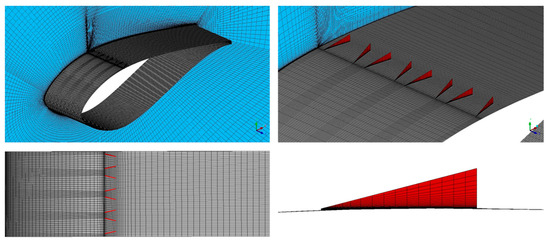 In the numerical calculation part, the chord length of the airfoil is consistent with the wind tunnel experiment. However, considering the calculation time and computing resources, the spanwise length is 140 mm, including 4 pairs of vortex generators, as shown in Figure 4a. VG mainly affects the flow state by generating the vortex structure through the geometric parameters shown in Table 2. Compared with other parameters, the thickness of VG has almost no effect on the formation and development of vortices. At the same time, considering the complexity of the calculation model, the VG calculation model is simplified to wall surfaces without thickness [17]. The calculation domain for the airfoil is set up as shown in Figure 4b. The upper and lower boundaries were 20 C away from the leading edge of the airfoil and set as the free-slip wall [39]. The inlet boundary was 20 C away from the leading edge of the airfoil and set as velocity inlet. The outlet boundary was 30 C away from the leading edge of the airfoil and set as pressure outlet. The boundaries on both sides were set as periodic conditions. And the airfoil wall was set as the nonslip wall.