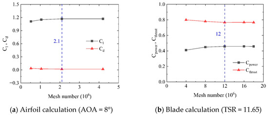 The structured hexahedral mesh was used to mesh the computational domains as shown in Figure 5. The first layer mesh height around the blade was set to 0.002 mm, resulting in y+ < 1.0, and a wall-normal expansion ratio of 1.1. 30 mesh nodes are divided in the h of VG and 20 mesh nodes are divided in the L. The mesh is encrypted in areas where the flow changes drastically. For airfoil calculations, and is stable when the number of mesh reaches 2.1 million. For blade calculations, and is stable when the number of mesh reaches 12 million, as shown in Figure 6. After the verification of grid independence, the number of airfoil calculation mesh is 2.1 million, and the number of blade calculation mesh is 12 million.