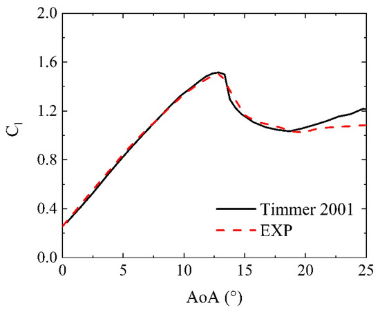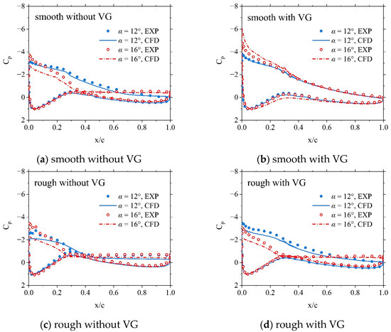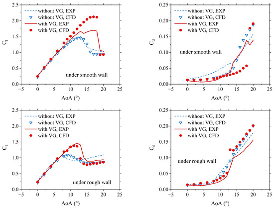 Analysis of experimental uncertainty is an effective explanation to ensure the reliability of experimental results. It actually encompasses many aspects such as models, wind tunnels, sensors, etc. Therefore, the effects of these factors can be excluded compared to the results of other investigators. Figure 7 shows the experimental results of clean airfoil compared to Timmer et al. [43]. The two results agree well, and they demonstrate the reliability of experimental results in this study. The experimental and CFD calculated values of the and of the airfoil are shown in Figure 8. The results are mostly close to between. But there are some differences. This difference is more pronounced at large angles of attack (AOA) with VG in the smooth condition. In this state, the maximum by CFD calculations is greater than by the experiment, similar to the results of others [24,31]. The possible reason for this is that a base surface for the entire row of fixation is present in the experimental model of VG. The VG is connected with the airfoil through this base surface. It causes a certain change in the flow of the airfoil surface at this location, such as the boundary layer being raised. These changes accelerate the flow separation on the surface, consequently resulting in a decrease in the . In contrast, the CFD calculation model does not have the base surface. As a result, these flow changes are not generated and the is lower than the experimental value. The presence of airfoil surface roughness makes the influence of the VG base surface on the flow negligible. Therefore, the experimental and calculated values are in good agreement under rough wall condition. Overall, the calculated values are essentially consistent with the experimental values, indicating that the CFD calculation results possess a certain degree of accuracy.
