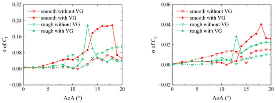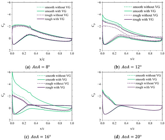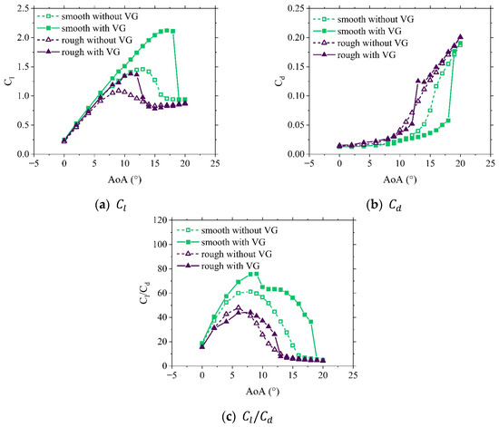 Figure 11b shows the effect of VG on the of the airfoil under smooth and rough walls. The of the rough wall is greater than that of the smooth wall under the same conditions. This is because the rough wall surface directly increases the frictional drag of the airfoil surface. When the AOA is between the stall AOA with and without VG, the with VG is less than that without VG. Outside this range, the effect of VG on the is almost negligible. The above situation shows that the influence of VG on the of the airfoil is more manifested in the process of delaying the airfoil into the stall state. Figure 11c shows the effect of VG on the of the airfoil under smooth and rough walls. Under smooth wall condition, the with VG is greater than that without VG. However, under rough wall condition, the with VG is less than without VG under some angles of attack. The reason is that VG increases the at these angles of attack, but at the same time increases the .