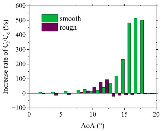 Figure 12 illustrates the distribution of the increase rate due to VG. It is possible to see the effect of VG on the of smooth and rough walls. At , VG increases the on rough walls more than on smooth walls. This is because the rough wall without VG has entered the airfoil stall region, while the smooth wall without VG is in the linear lift growth region. At , VG reduces the on rough walls. Because the airfoil has entered the stall zone with VG under rough wall condition, the VG does not continue to increase the lift. Likewise, due to the retarding effect of VG on the airfoil stall phenomenon, the increases while the decreases in the smooth wall condition. At , the experiences a significant increase. However, in some AOAs, VG leads to a decrease in .This is the negative impact of VG in aerodynamic performance of airfoil.