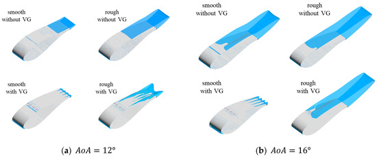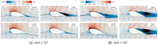 Figure 11a shows the effect of VG on the of the airfoil under smooth and rough walls. With smooth wall without VG, the maximum of the airfoil is 1.458, and the corresponding stall AOA is 13°. With rough wall without VG, the maximum of the airfoil is 1.089, and the corresponding stall AOA is 9°. The rough wall reduces the of the airfoil and advances the stall AOA. The installation of the VG delays the stall AOA in two states, 18° for smooth wall and 12° for rough wall. When the AOA is less than the stall AOA with VG, the is greater than that without VG. At the same time, the range of increased increases as the AOA increases. However, when the AOA exceeds the stall AOA of the airfoil installation VG, the flow control effect of the VG fails, and the is slightly less than that without VG. It is worth noting that the distribution of with VG on rough walls is close to that without VG on smooth walls.