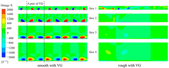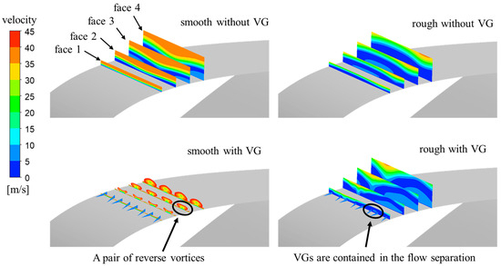 To better explain the cause of VG failure under rough wall condition at , the velocity distribution near VG is shown in Figure 16. Under smooth wall condition without VG, there is a very thin boundary layer at the position of face 1, which has a large velocity gradient. With the flow in the chordal direction, the boundary layer gradually thickens on face 2. Then the flow separates on faces 3 and 4. Under rough wall condition without VG, flow separation has occurred on face 1. Subsequently, the height of the flow separation gradually increases. And the velocity gradient of the air flow becomes smaller due to the slower velocity. Under smooth wall condition with VG, the velocity around VG and the wake area is largely increased through VG. As the flow develops, velocity equivalent regions in the shape of are formed. The velocity increases in the outward direction of their center. At the same time, this region has a large velocity gradient. The energy is transferred to the boundary layer through the mixing of the external fluid with the boundary layer fluid. This results in greater velocity near the airfoil wall and a decrease in the thickness of the flowing boundary layer. Pairs of reverse vortices are formed, when the airflow through the VG as shown in Figure 17. The cross-sectional area of the vortex gradually increases with the development of flow. It reaches its maximum on face 3 position. Subsequently, its area does not change and the vortex intensity decreases on face 4. The vortices carry energy from the outside into the boundary layer and is used to resist the inverse pressure gradient. The turbulent separation of the boundary layer is eliminated. Under rough wall condition with VG, some VGs (VGs on the right side) are already within the bounds of boundary layer separation as shown in Figure 16. Although VG still accelerates the flow, the original velocity is low and large velocity gradient cannot be formed. The effective vortices cannot be formed as shown in Figure 17. It causes fluid with high external velocities to be unable to mix with the fluid inside the boundary layer. The energy cannot be transferred into the boundary layer. The other VGs (VGs on the left side) form a certain effective effect due to the instability of the flow in the span direction.