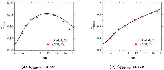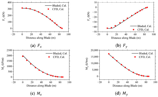 The power coefficient () and thrust coefficient () of wind turbine blade obtained by different calculation methods are shown in Figure 18. The Bladed calculation results were obtained by Bladed commercial software (https://www.dnv.com/software/services/bladed/). The two calculation results are in good agreement. The effect of VG on the aerodynamic performance of the blade is more pronounced in the region of smaller TSR. Therefore, the radial load of the blade at the TSR = 9.32 was extracted and compared. Both calculations only consider aerodynamic loads and ignore the effects of gravity and centrifugal force. As shown in Figure 19, the blade load spanwise distributions calculated by CFD and Bladed are in good agreement under TSR = 7.76. The accuracy of the CFD calculation results is determined by comparing the results of the blade radial load obtained by two different calculation methods.