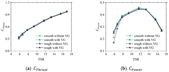 The flow separation of the blade mainly occurs between the middle section and the root of the blade. The transition section to the cylindrical segment at the root of the blade does not have a good aerodynamic shape. The contribution of blade elements to aerodynamic forces is very small in this position. So, the installation of VG is between 15~56% of the blade radius. Figure 20a shows the effect of VG on the under two wall conditions. As can be seen from the figure, VG has almost no effect on the . The four curves coincide. VG makes a slight increase in thrust coefficient only at smaller TSR. When TSR = 5.83, the increases from 0.3098 to 0.3501 at the smooth wall condition, and from 0.3052 to 0.3378 at the rough wall condition. Detailed data is shown in Table 3. As shown in Figure 20b, the effect of VG on was mainly manifested in the range of TSR = 5.83~7.76. There has been an increase in with VG. When the incoming wind speed changes for a short period of time, the TSR of HAWT may be in this range due to the delay in the response of the pitch system. When TSR = 5.83, the increases from 0.2126 to 0.2618 at the smooth wall condition, and from 0.1629 to 0.2501 at the rough wall condition. At the same time, the at the rough wall coincide is lower than that at the smooth wall coincide. Detailed data is shown in Table 4.