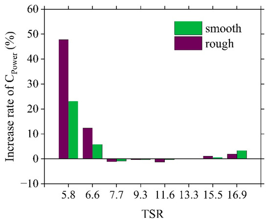The effect of VG on the is expressed by the increase rate of . As shown in Figure 21, When TSR 7.7, the effect of VG significantly increases the . At the same time, the increase of under rough wall condition was 47.8% by VG and higher than under smooth wall condition. The increase rate is about twice that under smooth wall condition. The reason is that the AOA of the blade elements gradually increases with the decrease of the TSR. The AOA of most blade elements in the middle of the blade are about at (the AOA range of increase rate due to VG at rough wall condition in Figure 12). Between TSR = 7.7~13.3, VG showed a negative effect on the increase of . The reason is that the AOA of most blade elements is in the range of small AOA. VG reduces the of airfoil.